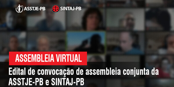 Pelo presente Edital as Diretorias Executivas da ASSTJE-PB e do SINTAJ-PB, respectivamente, nos termos dos artigos 14 e 16, do inciso I do artigo 17 e dos artigos 18 e 21 do Estatuto Social da primeira e dos artigos 7º, 9º, em seu inciso I,bem como os artigos 11, 12, 13, 14 e seu parágrafo único, e, de forma complementar, pelos artigos 15 e 16, do Estatuto Social do segundo, RESOLVEM CONVOCAR as categorias funcionais que as duas Entidades representam para participarem de Assembleia Geral, na modalidade virtual, de acordo com o disposto no artigo 5º e seu parágrafo único, da Lei Federal n. 14.010/2020,designada para o dia 26 de outubro de 2020, às 19:30 horas, em primeirachamada, ou, às 20:00 horas, em segunda e última chamada.