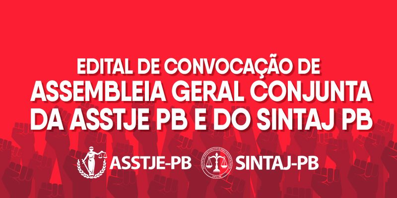 Pelo presente Edital, as Diretorias Executivas da Associação dos Servidores da Secretaria do Tribunal de Justiça do Estado da Paraíba (ASSTJE-PB) e do Sindicato dos Técnicos e Analistas do Judiciário da Paraíba (SINTAJ-PB), em cumprimento às deliberações de suas diretorias, em reuniões realizadas em separado, a primeira no dia 24 de fevereiro de 2023, de maneira virtual, e a segunda no dia 25 de fevereiro de 2023, na modalidade presencial, quanto à primeira entidade, nos termos dos artigos 14 a 19 e 52 de seu Estatuto Social e, em relação à segunda entidade, nos termos do parágrafo único, do artigo 7″, incisos VI e VII do artigo 8″, inciso I do artigo 90, artigos 11, 12, 13 e 14 e seu parágrafo único, de seu Estatuto Social, e, em conformidade com a legislação vigente, resolvem, CONVOCAR, em caráter exclusivo, os associados das duas Entidades para participarem da Assembleia Geral Extraordinária, a se realizar no dia 02 de março de 2023, às 19h00m em primeira chamada e às 19h30m horas, em segunda e última chamada, na modalidade virtual, pela plataforma do ZOOM, nos termos que dispõe a Lei Estadual n” 11.828, de 30 de dezembro de 2020, publicada no Diário Oficial do Estado da Paraíba, em 06 de janeiro de 2021, que instituiu normas de caráter transitório e emergencial sobre reuniões e assembleias de pessoas jurídicas de direito privado, enquanto perdurar a vigência do Decreto Estadual n° 40.652, de 19 de outubro de 2020, para apreciar e deliberar sobre os seguintes pontos da pauta: